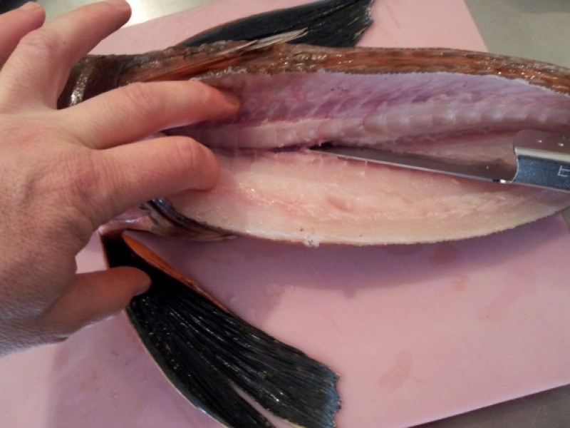 Pulire ed eviscerare il Pesce, con l'aiuto di una forbice praticare una incisione fonda  alla base della testa e una in prossimità della coda , con uno sfilettatore sfilettare la lisca centrale, ottenendo un pesce aperto dalla schiena ,pronto ad esser farcito .Sistemare in  una teglia con un foglio di carta da forno.