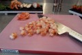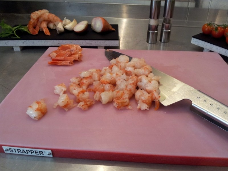 Fare un trito con lo scalogno , l'aglio e il prezzemolo. Tagliare il pane da tramezzini a piccoli cubetti. Sgusciare le code di gambero e privarle del cordone centrale incidendoli per la lunghezza e sfilandolo con la punta di un coltellino ,tagliandole in pezzetti da  1 cm.